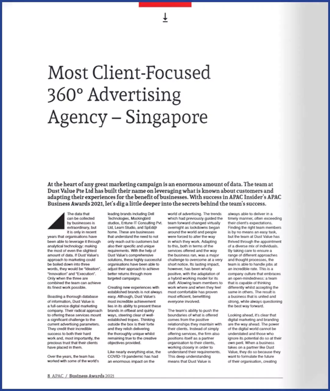 Ideation, Innovation, and Execution have always been the mantra at Dust Value. Creating new experiences for all brands is not an easy task, but our team has executed it effortlessly. Dust Value, Singapore has been honored with the Most Client – Focused 360֯ Advertising Agency award and has been featured in the APAC Insider Magazine. Read on to understand our journey of delivering the right experience to the right people at the right time.