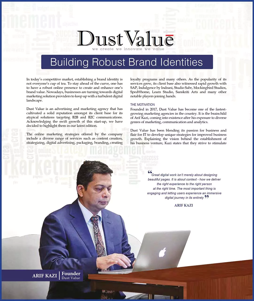 Delivering the right experience to the right people at the right time is what Mr. Arif Kazi believes in. As true as it rings, we at Dust Value believe in understanding our clients, building long term relationships with them and treating them like our partners! Read on to know more about our Founder Director’s exceptional journey and rich experiences in the field of Digital Marketing, from his cover story published in the Fortune India Exchange magazine.