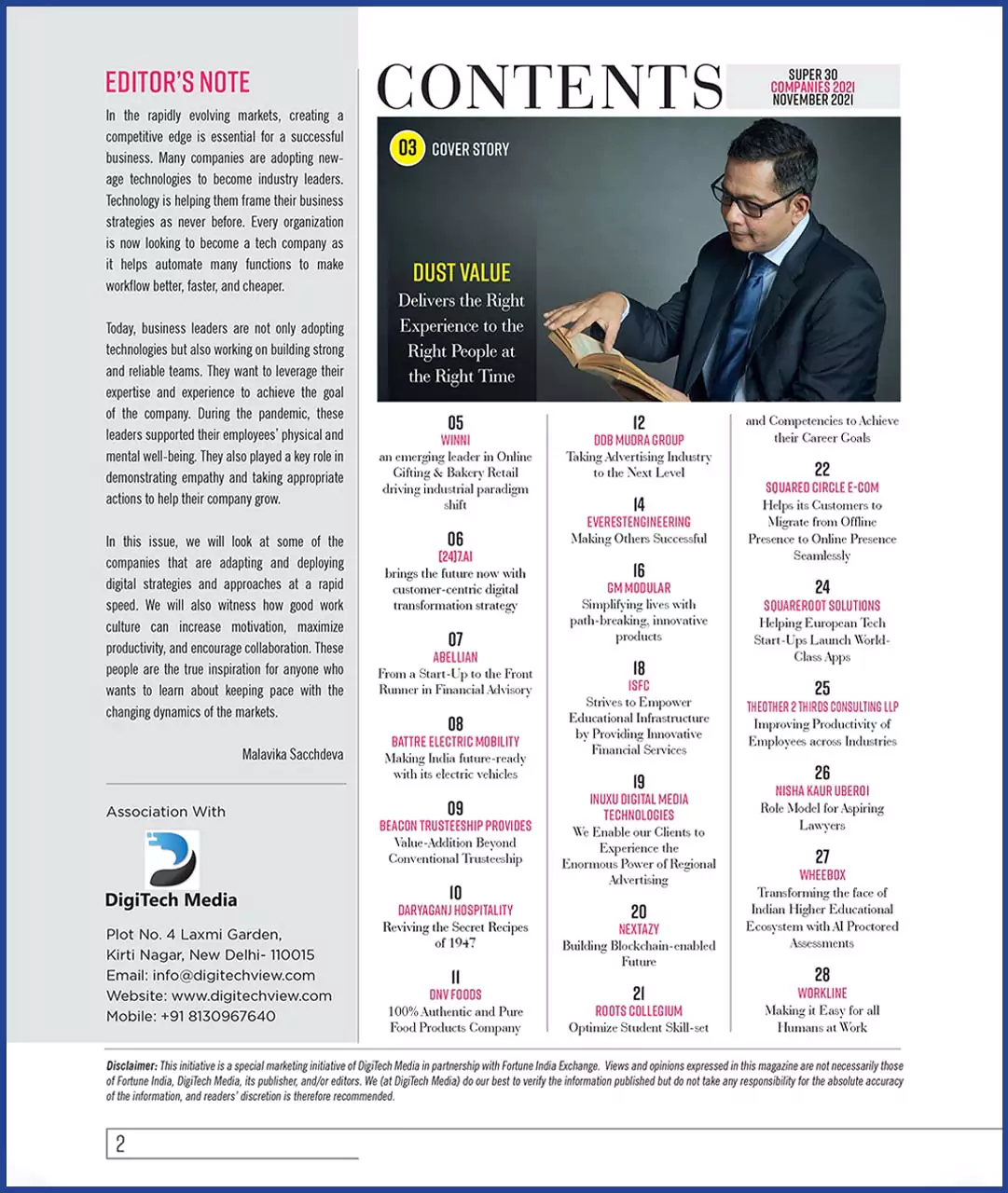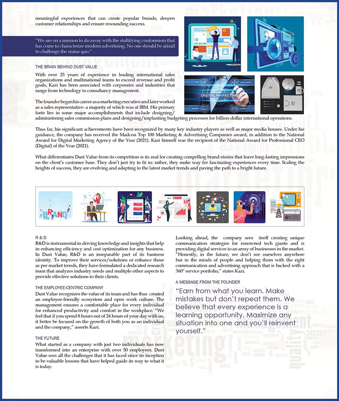 Delivering the right experience to the right people at the right time is what Mr. Arif Kazi believes in. As true as it rings, we at Dust Value believe in understanding our clients, building long term relationships with them and treating them like our partners! Read on to know more about our Founder Director’s exceptional journey and rich experiences in the field of Digital Marketing, from his cover story published in the Fortune India Exchange magazine.