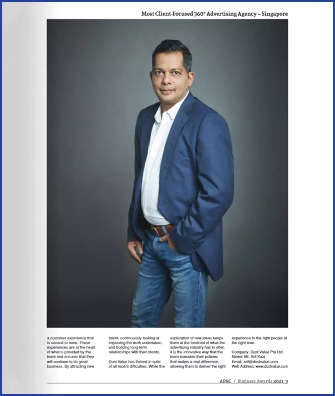 Ideation, Innovation, and Execution have always been the mantra at Dust Value. Creating new experiences for all brands is not an easy task, but our team has executed it effortlessly. Dust Value, Singapore has been honored with the Most Client – Focused 360֯ Advertising Agency award and has been featured in the APAC Insider Magazine. Read on to understand our journey of delivering the right experience to the right people at the right time.